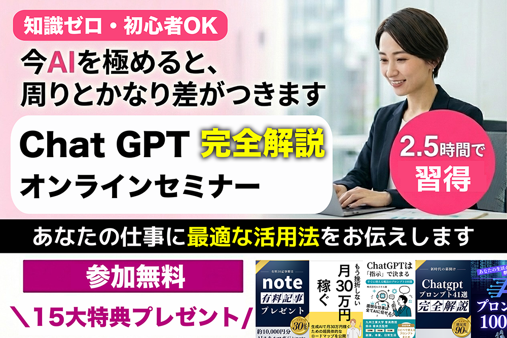 無料AIセミナーでChatGPTをマスター。参加者全員へ15大特典プレゼント AIアンケLP【meta_d101】FV1
